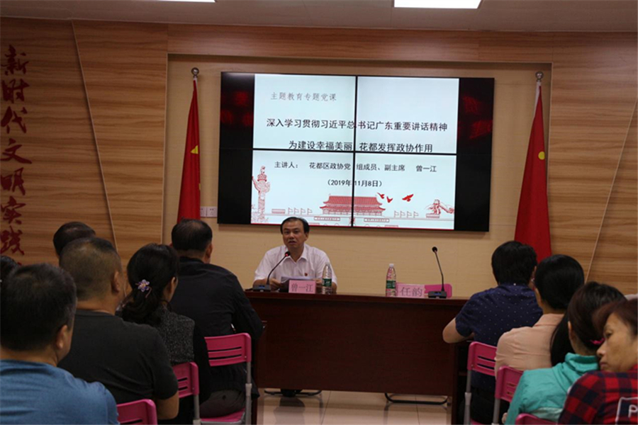 曾一江副主席从“学习领会习近平总书记广东重要讲话精神要把握的重点、贯彻落实习近平总书记广东重要讲话精神区政协的定位和职责及发挥政协作用所做的工作” 三个方面介绍了区政协在区委的坚强领导下,始终把学习贯彻习近平总书记对广东重要讲话和重要指示批示精神,作为政协开展工作的头等大事和首要政治任务,全面统筹和推进政协各项工作,不断推动我区政协各项工作取得新突破,取得新成绩,阐述了如何让党的十九大精神和学习贯彻习近平总书记两次对广东重要讲话和重要指示批示精神在政协落地生根。
