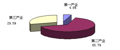 第一产业增加值23.51亿元,增长1.5%;第二产业增加值321.52亿元,增长13.8%;第三产业增加值144.52亿元,增长12.4%。三次产业占生产总值比重为4.8:65.7:29.5,与上年相比,第一产业比重下降0.5个百分点;第二和第三产业分别上升0.3和0.2个百分点。一、二、三产业对经济增长的贡献率为0.5%、70.9%和28.6%,对经济的拉动作用分别为0.6、9.1和3.1个百分点。