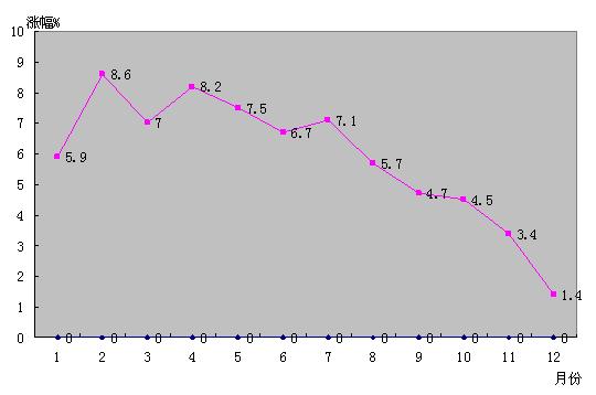 2008年,价格总水平呈冲高回落走势。全年城市居民消费价格总水平比上年上涨5.9%,涨幅比2007年提高2.5个百分点,比2008年上半年回落1.4个百分点。其中,消费品价格上涨7.7%,服务项目价格上涨1.7%。构成消费价格指数的八大类商品服务价格中,食品类价格涨幅回落是城市居民消费价格涨幅回落的主要因素。全年食品类价格上涨15.4%,涨幅比上半年回落3.4个百分点,其中肉禽类及制品价格涨幅回落13.0个百分点;交通通讯类、娱乐教育文化用品及服务类价格比上年分别下降1.2%和0.8%;烟酒及用品类、衣着类、家庭设备用品及维修服务类、医疗保健和个人用品类、居住类依次上涨3%、0.3%、1%、3.1%和4.6%。农村居民消费价格总水平同比上涨9.9%,涨幅比上半年回落3.0个百分点,比上年提高6.7个百分点。
