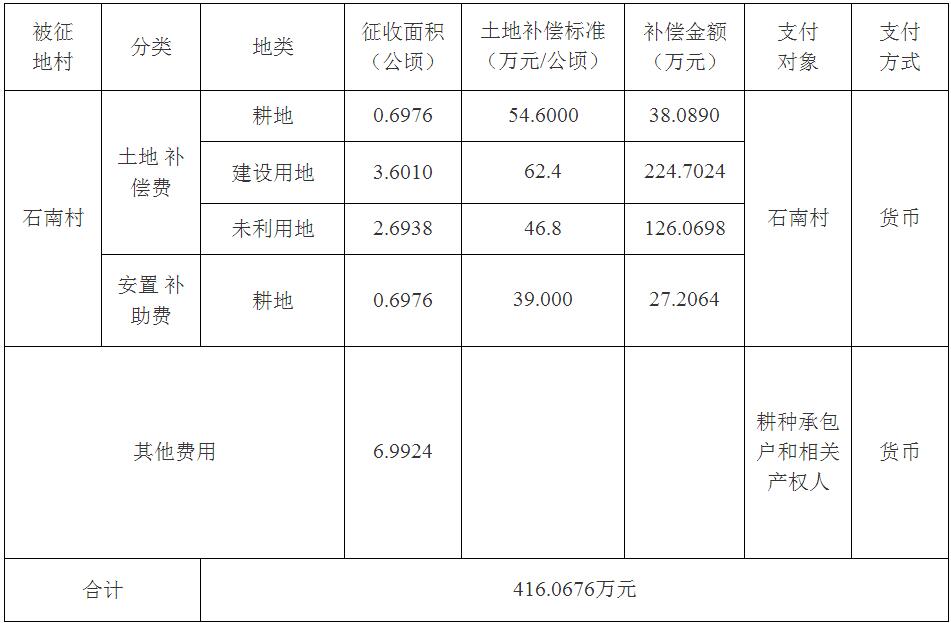 区炭步镇石南村的集体土地合计6.9924公顷(合104.8860亩),其中耕地0.6976公顷(合10.4640亩)、建设用地3.6010公顷(合54.0150亩)、未利用地2.6938公顷(合40.4070亩)。